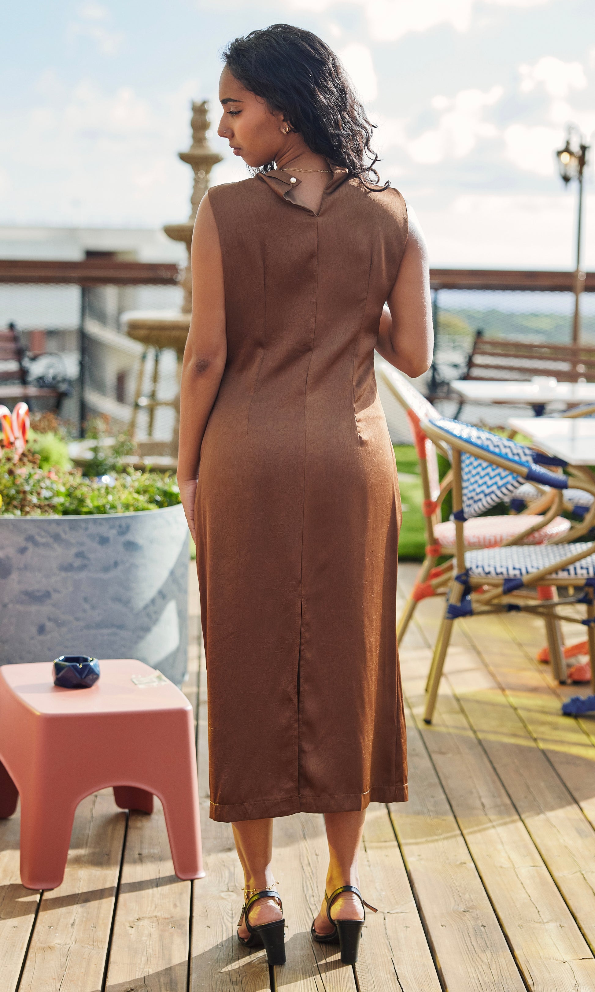 robe uni coupe midi avec découpe et broche dorée